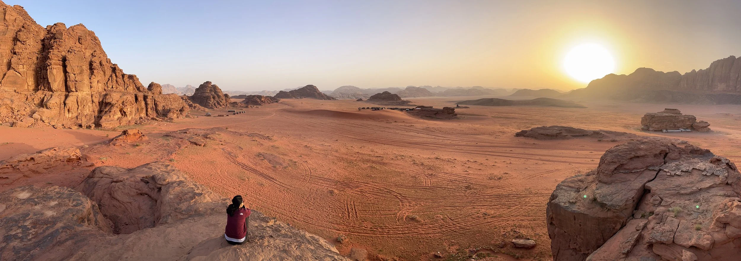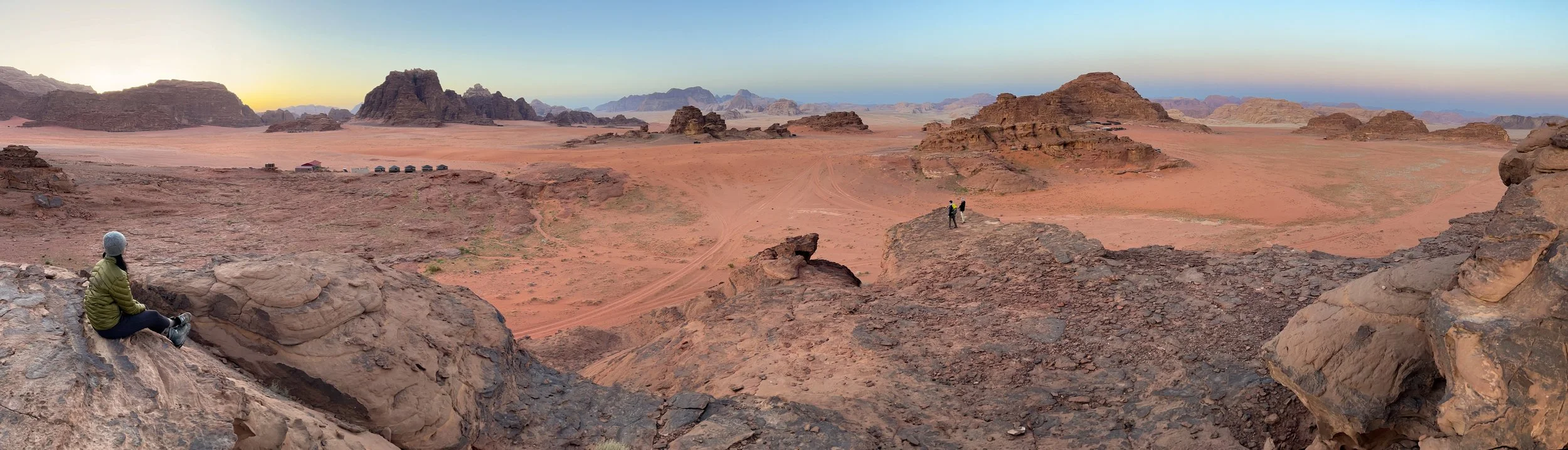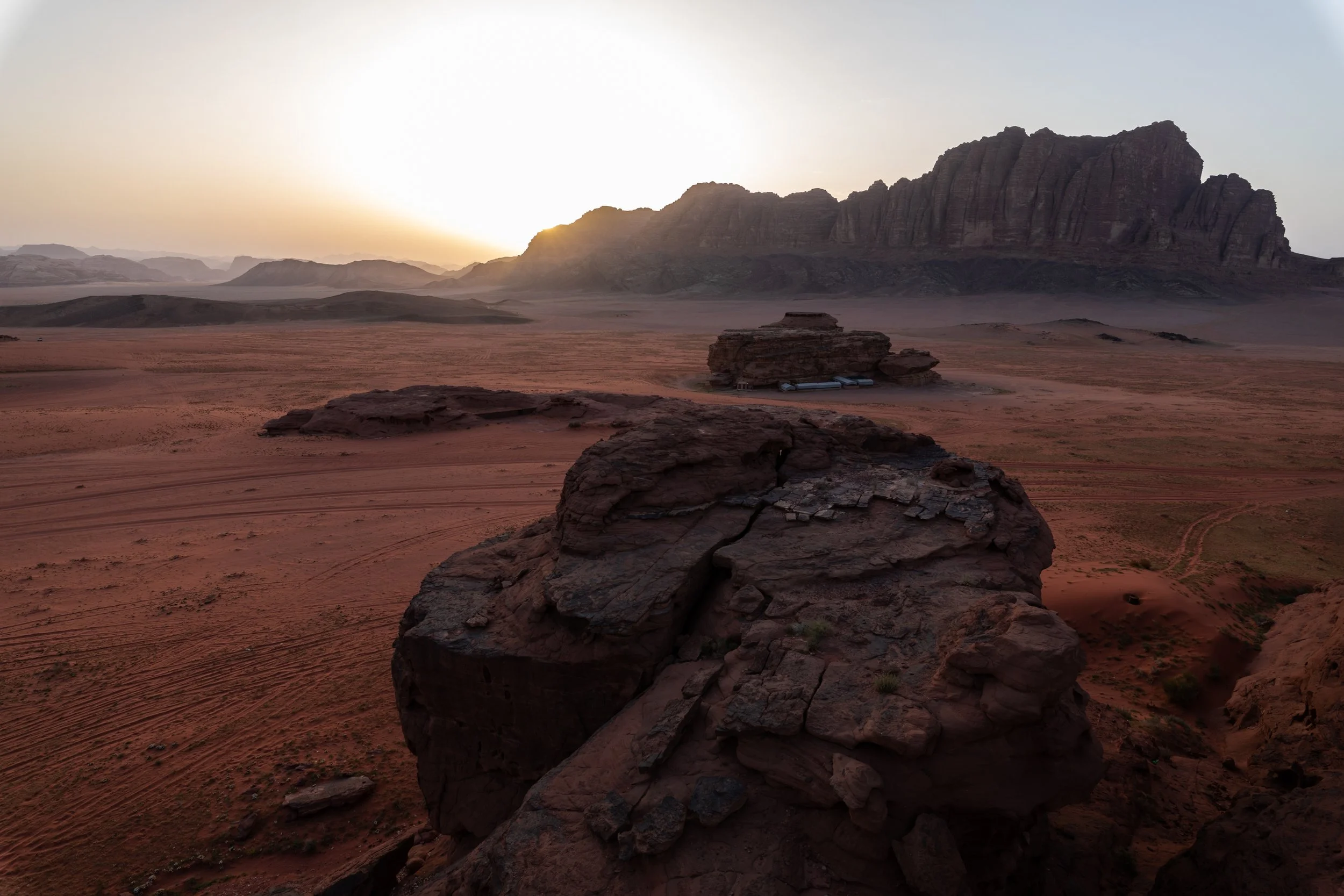 Towards sunset, we climbed the rock formations right behind our camp to watch the sun go to sleep. There was a haze in the air, and as the sun slowly dropped low in the distance, the world was filtered by its amber glow. Perched atop that rock mound looking down at the red expanse before us, with very little imagination, we could have easily believed we were sitting on another world or perhaps even on Mars.
