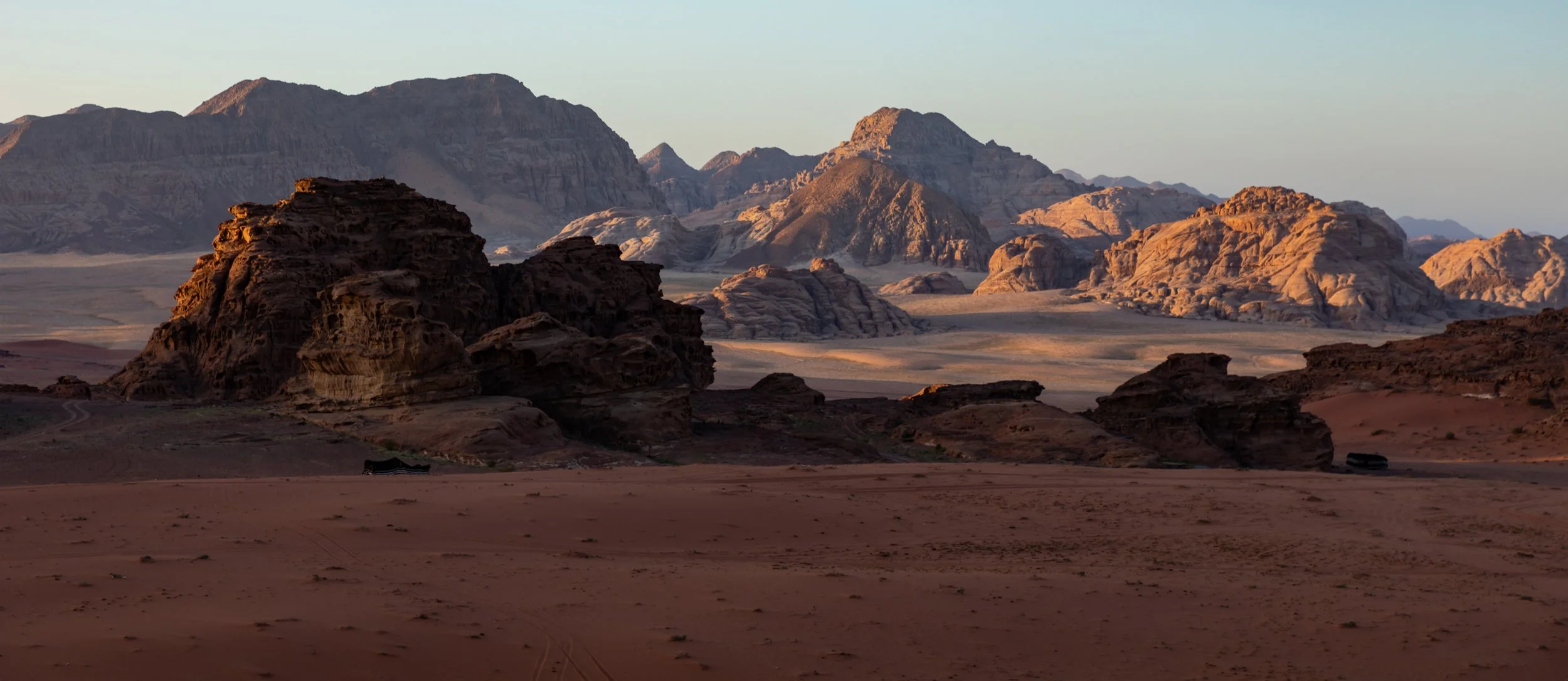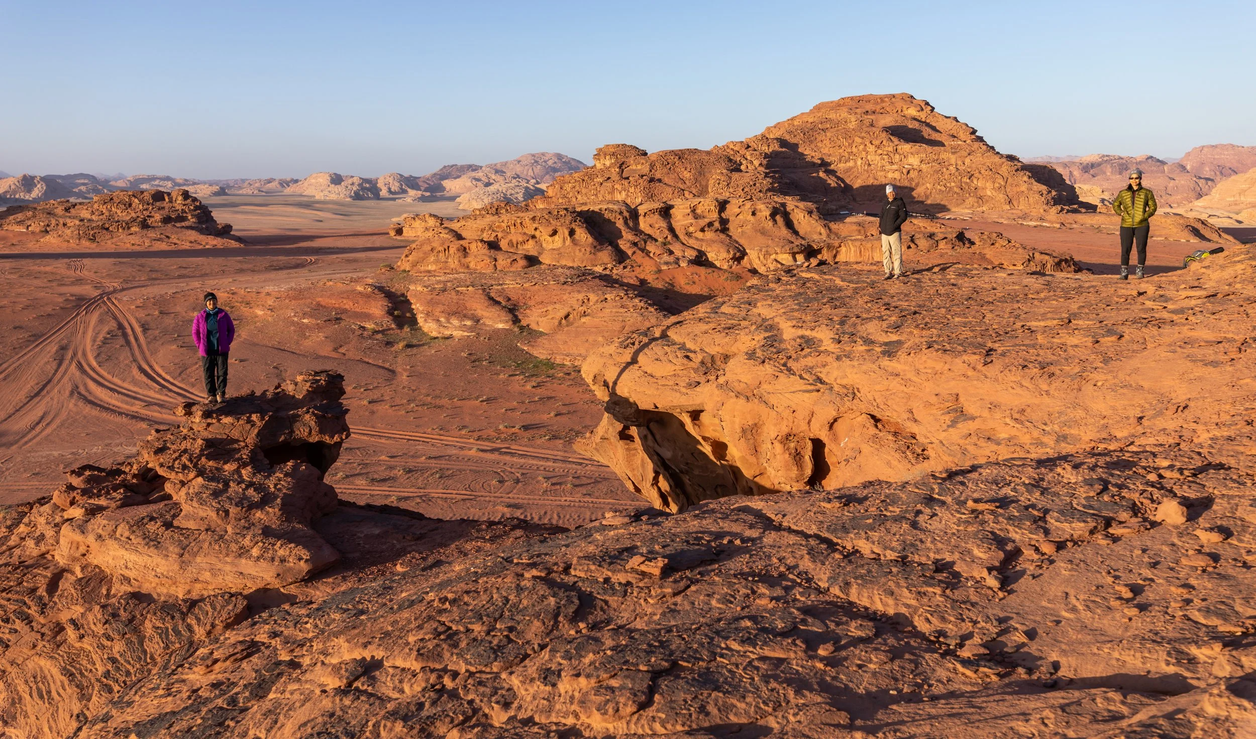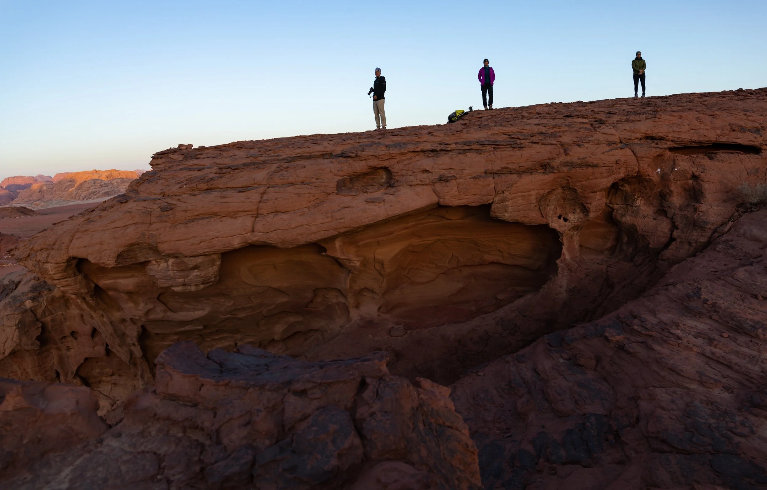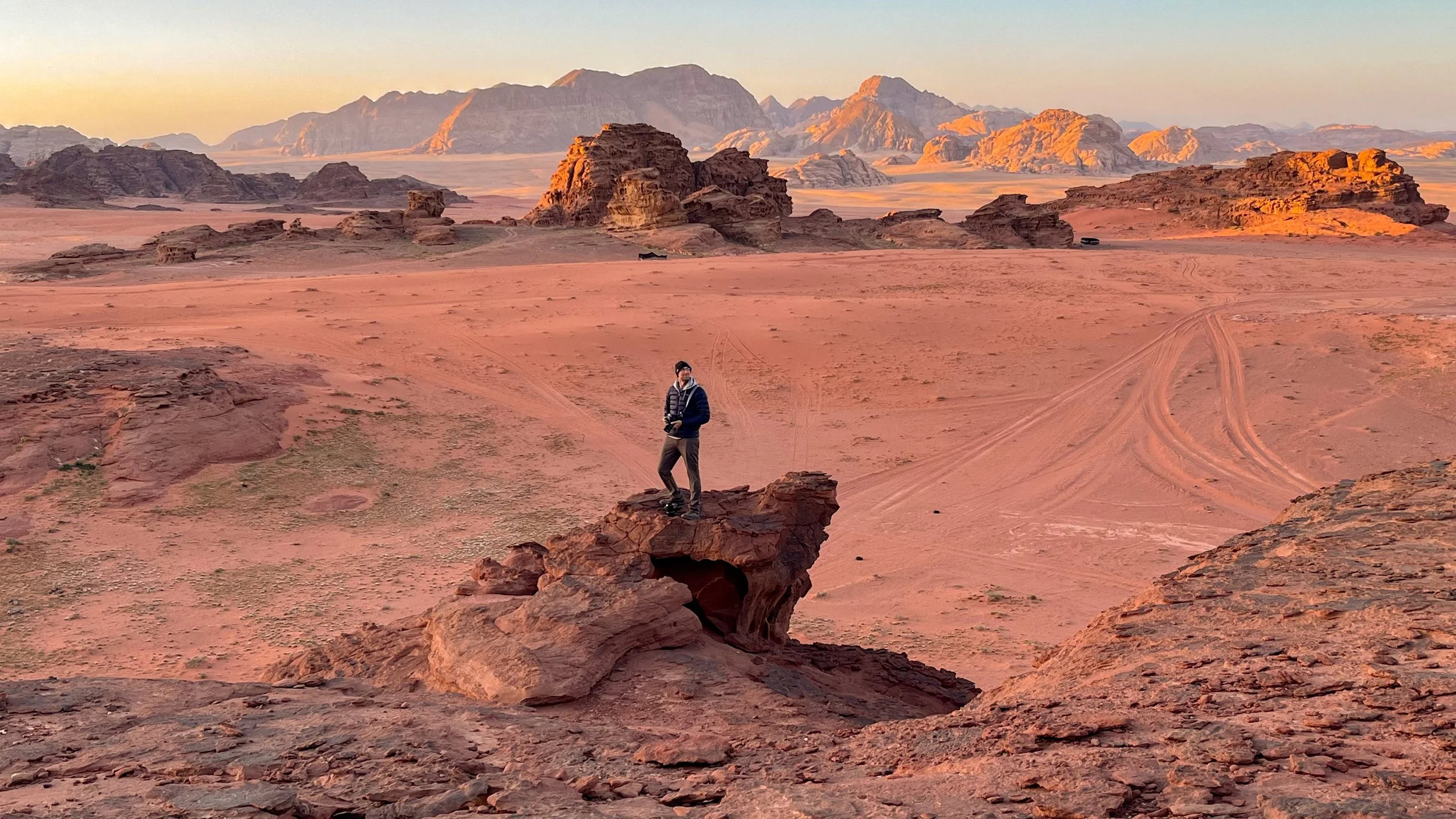 Towards sunset, we climbed the rock formations right behind our camp to watch the sun go to sleep. There was a haze in the air, and as the sun slowly dropped low in the distance, the world was filtered by its amber glow. Perched atop that rock mound looking down at the red expanse before us, with very little imagination, we could have easily believed we were sitting on another world or perhaps even on Mars.
