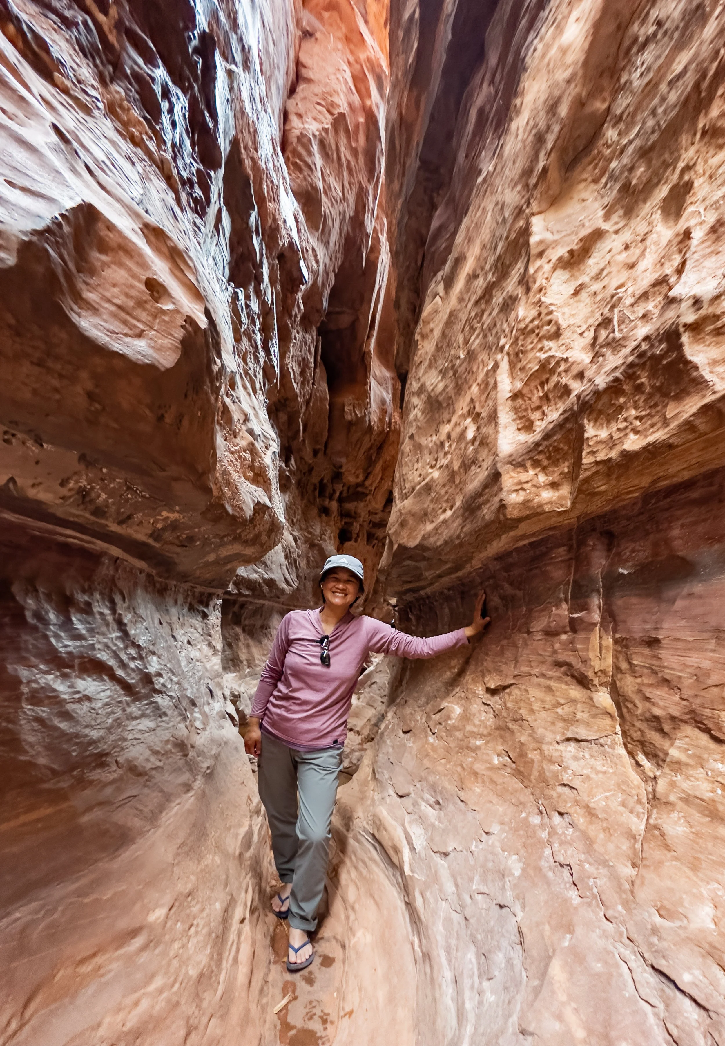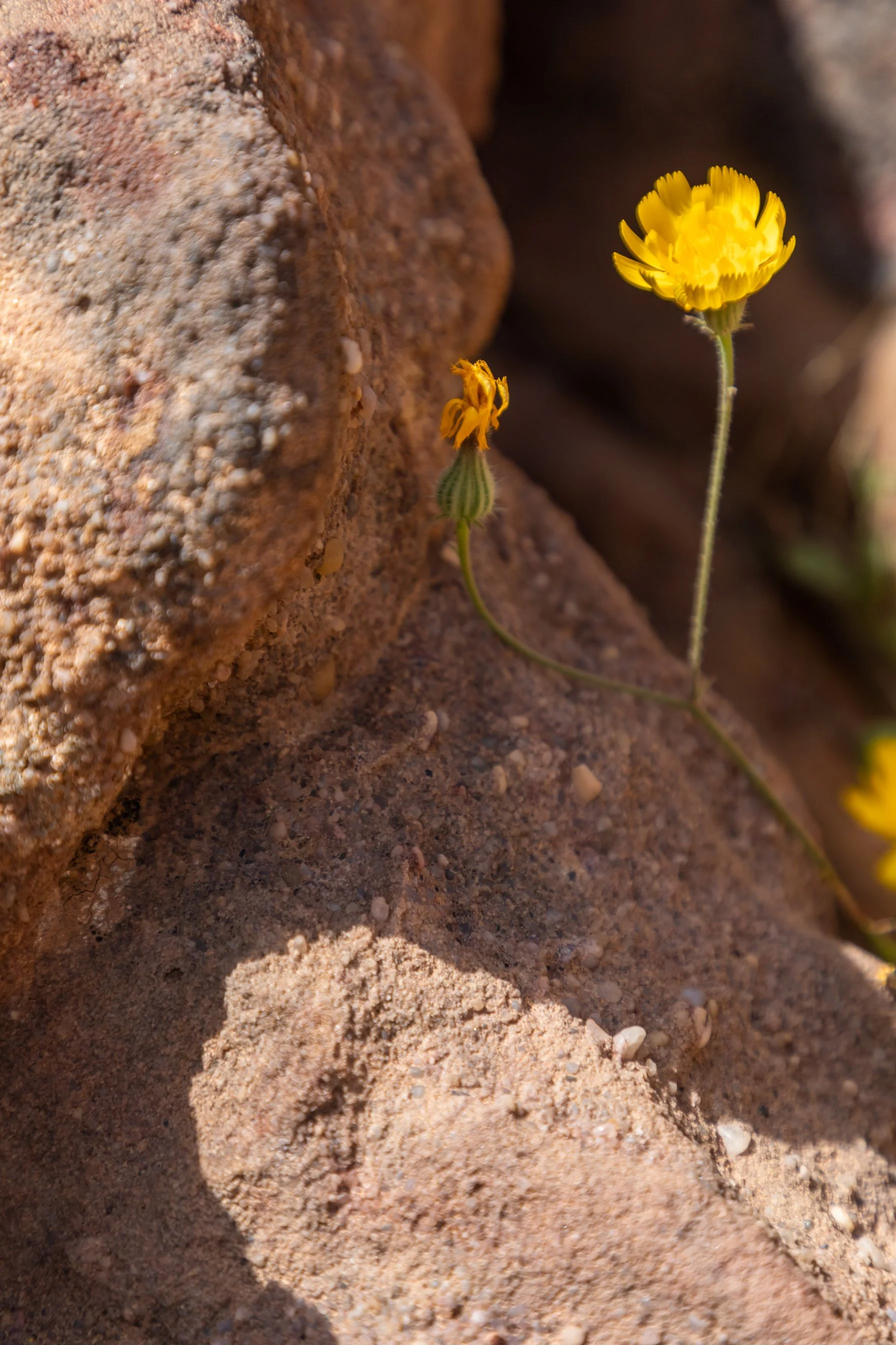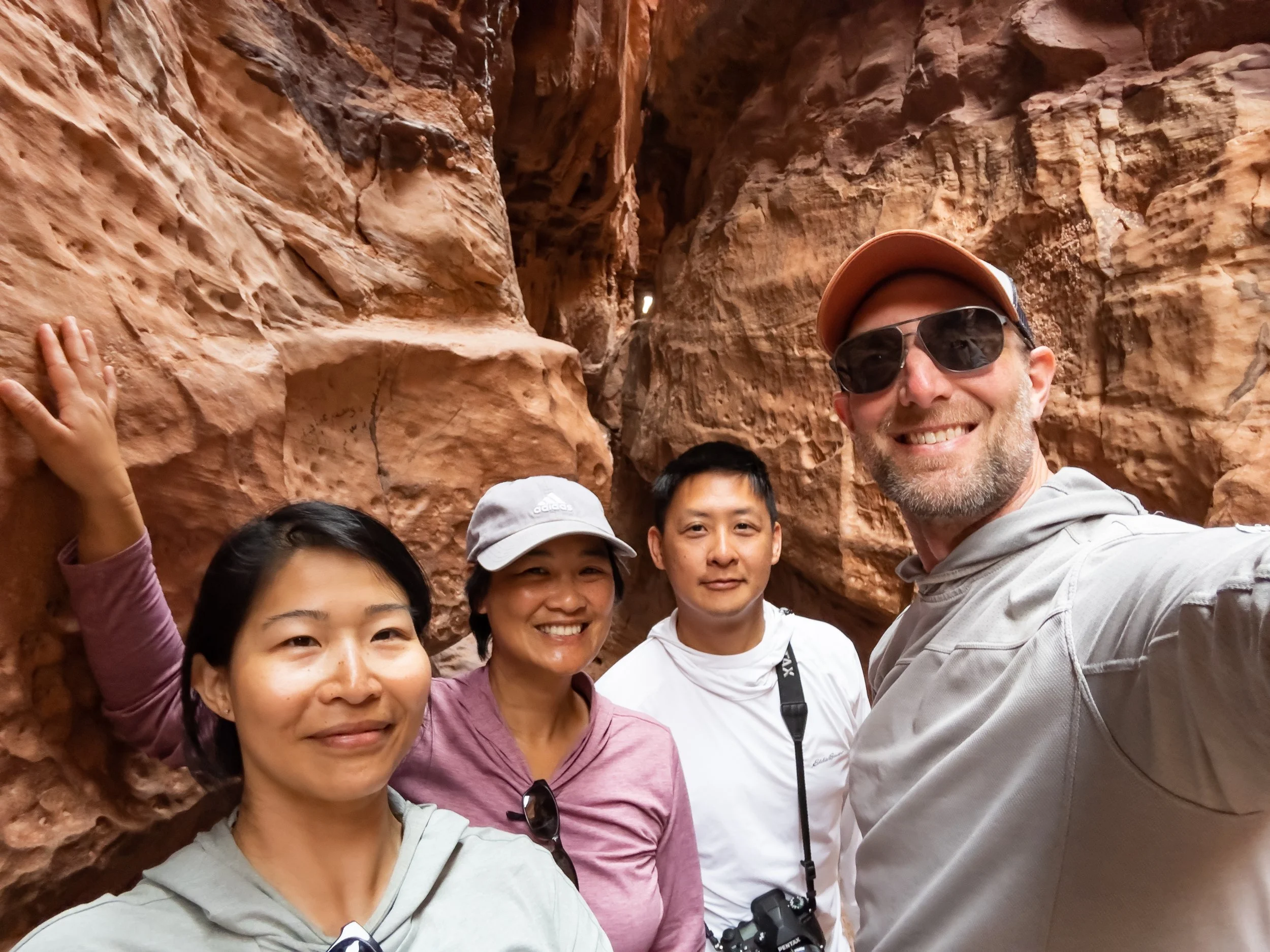 It didn’t help our pace that the first section of the trail was decorated with wildflowers set against the red rocks. The contrast in colors was so striking, it forced us to stop and admire them. We couldn’t help it. In fact, Lyle and I were so slow taking pictures of flowers that we almost missed the colorful lizard Lama and Phong had found ahead. They softly called for us to hurry. We only caught a glimpse of it before it headed back under a rock.