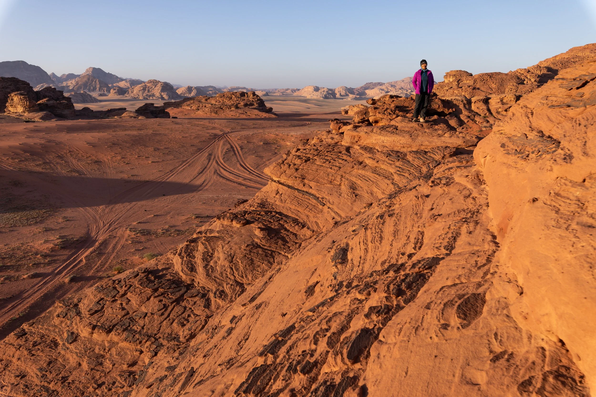 At the southern end of Wadi Rum we find Jordan’s highest peak, Jebel Um Ad Dami, our destination for the day, and also the last hike on our trip. From the van, we transferred over to the bed of a truck that drove us to our camp so we can drop off our luggage, use the restroom and refill our water bladders before heading out.
