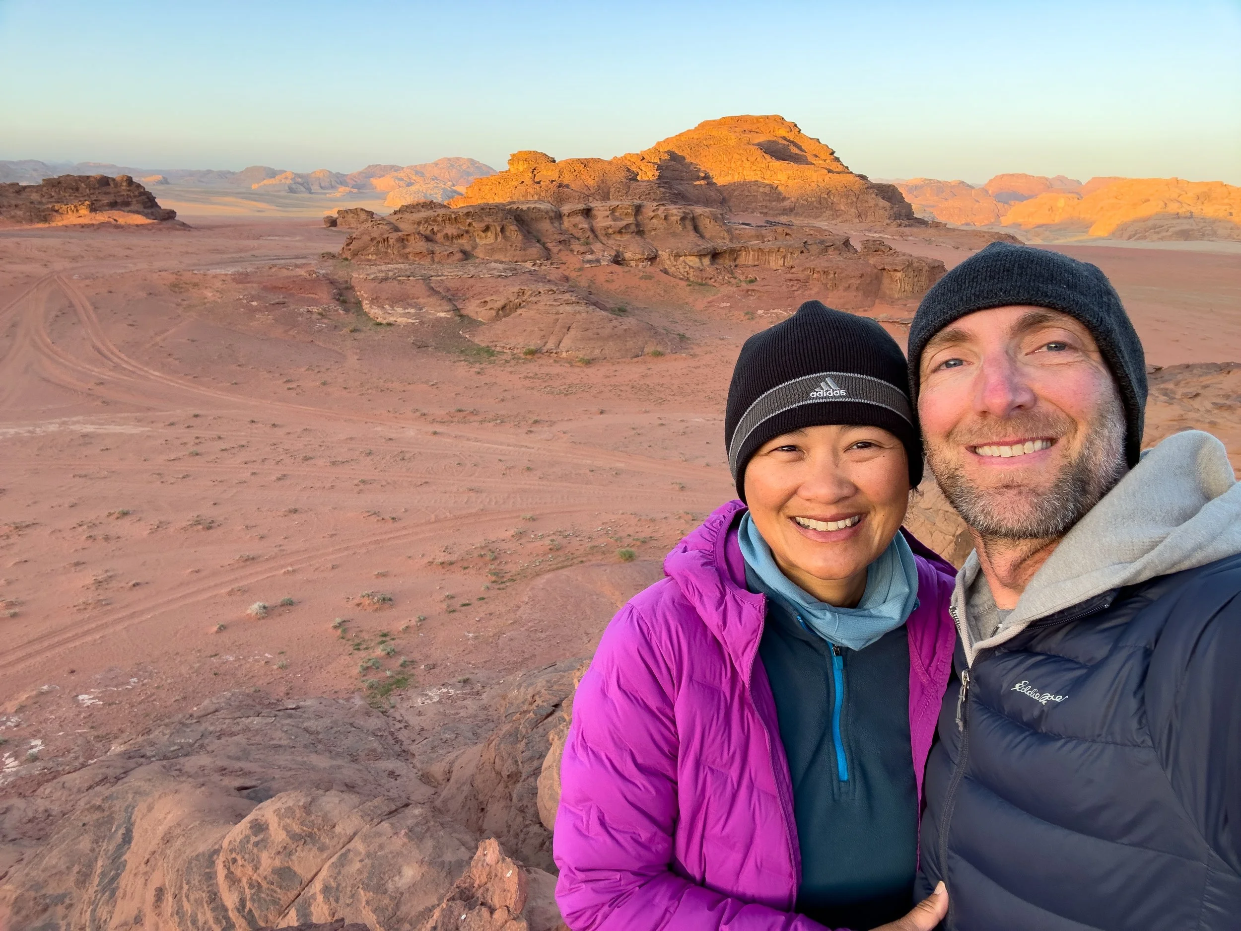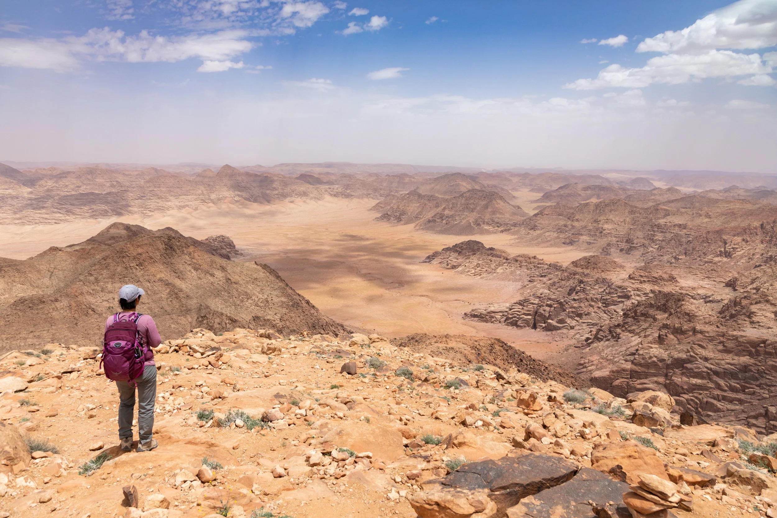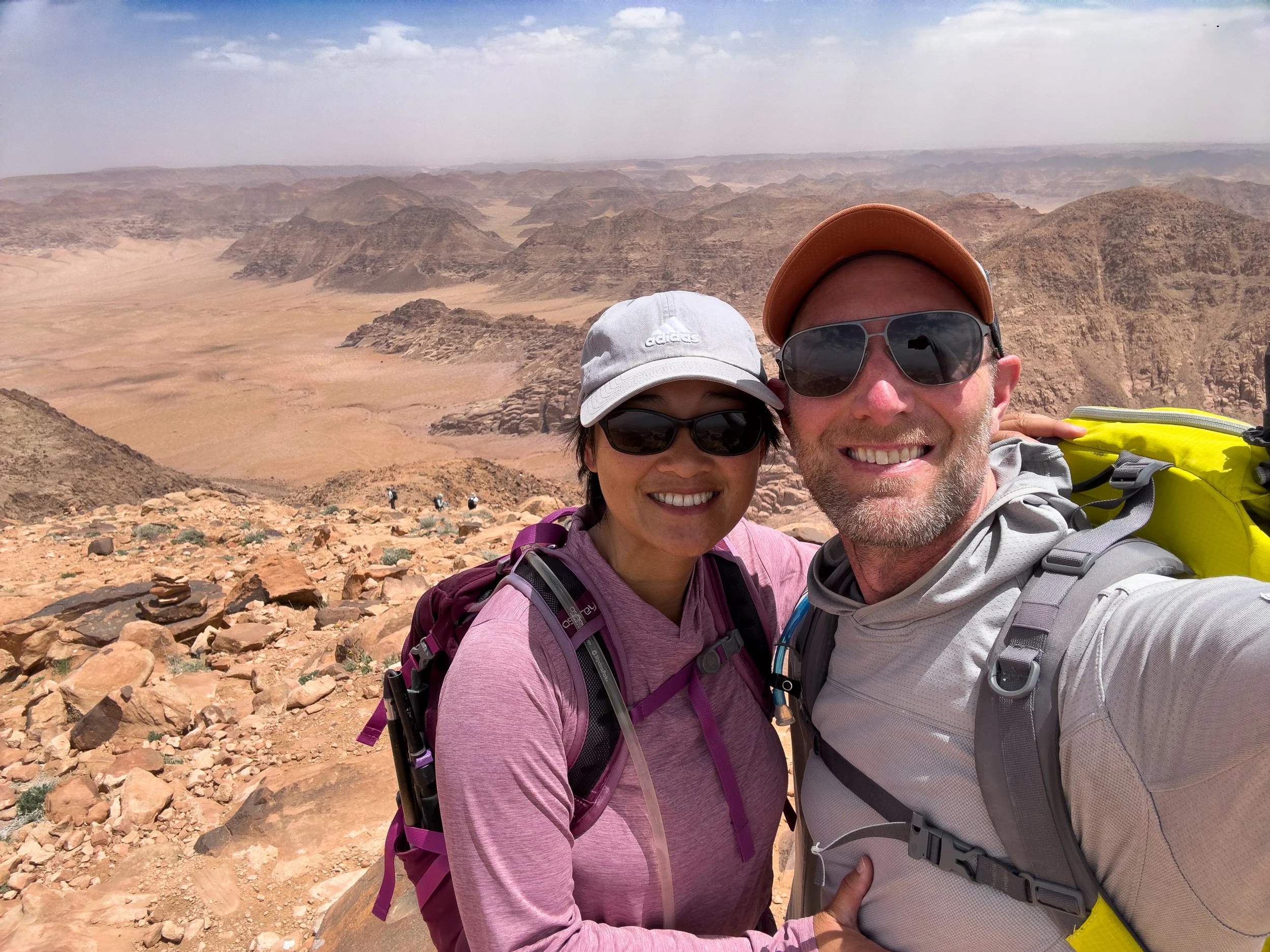 The summit of Jebel Um Ad Dami sits at 6,083 ft. and has a 360 degree panoramic view, looking north into Wadi Rum Preservation Region and looking south, straight across the border into Saudi Arabia. It looked like a painting and each direction was a distinct and unique color palette...beautiful!!
