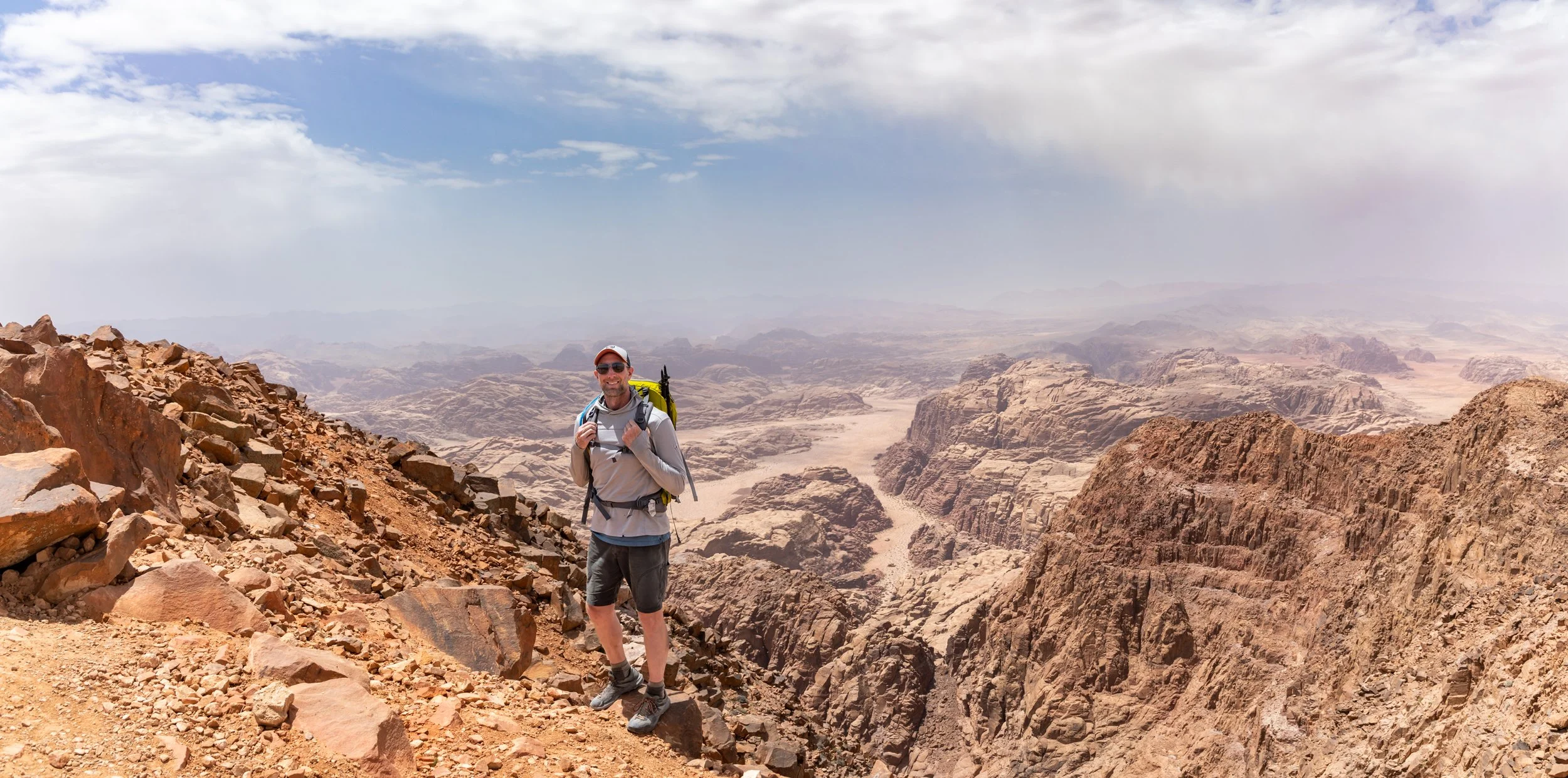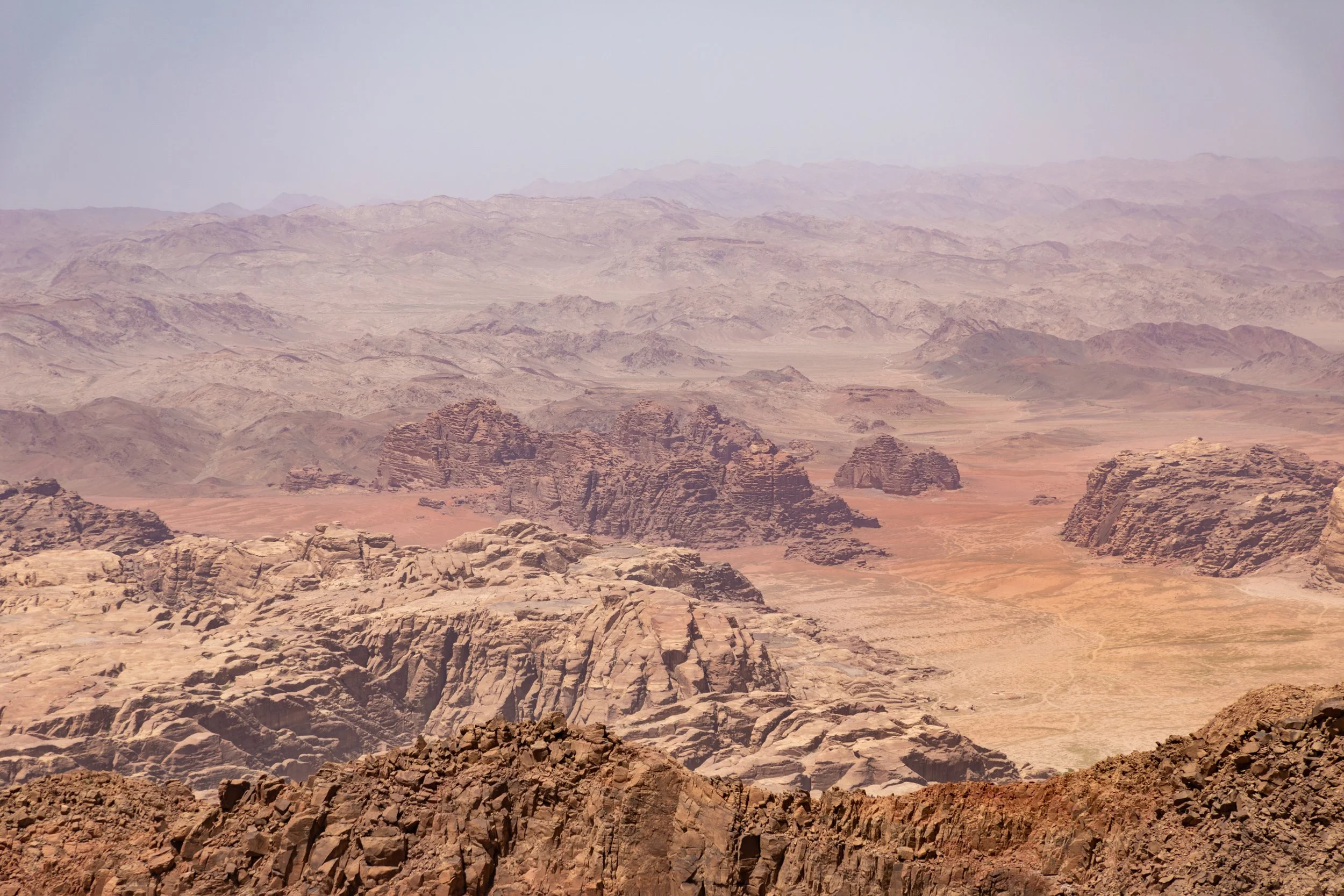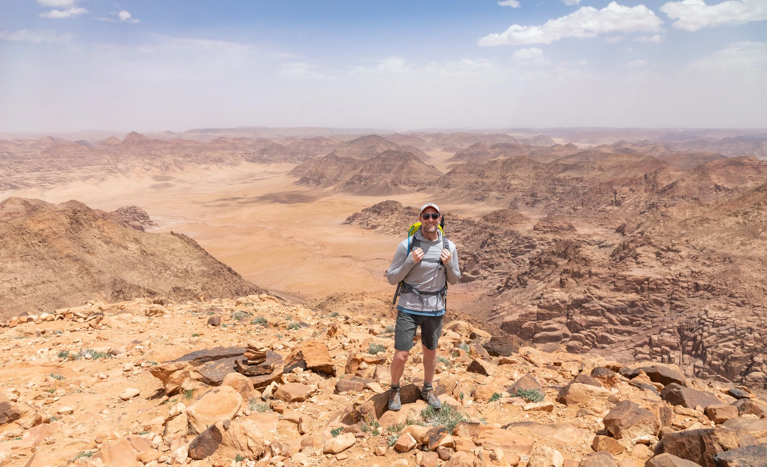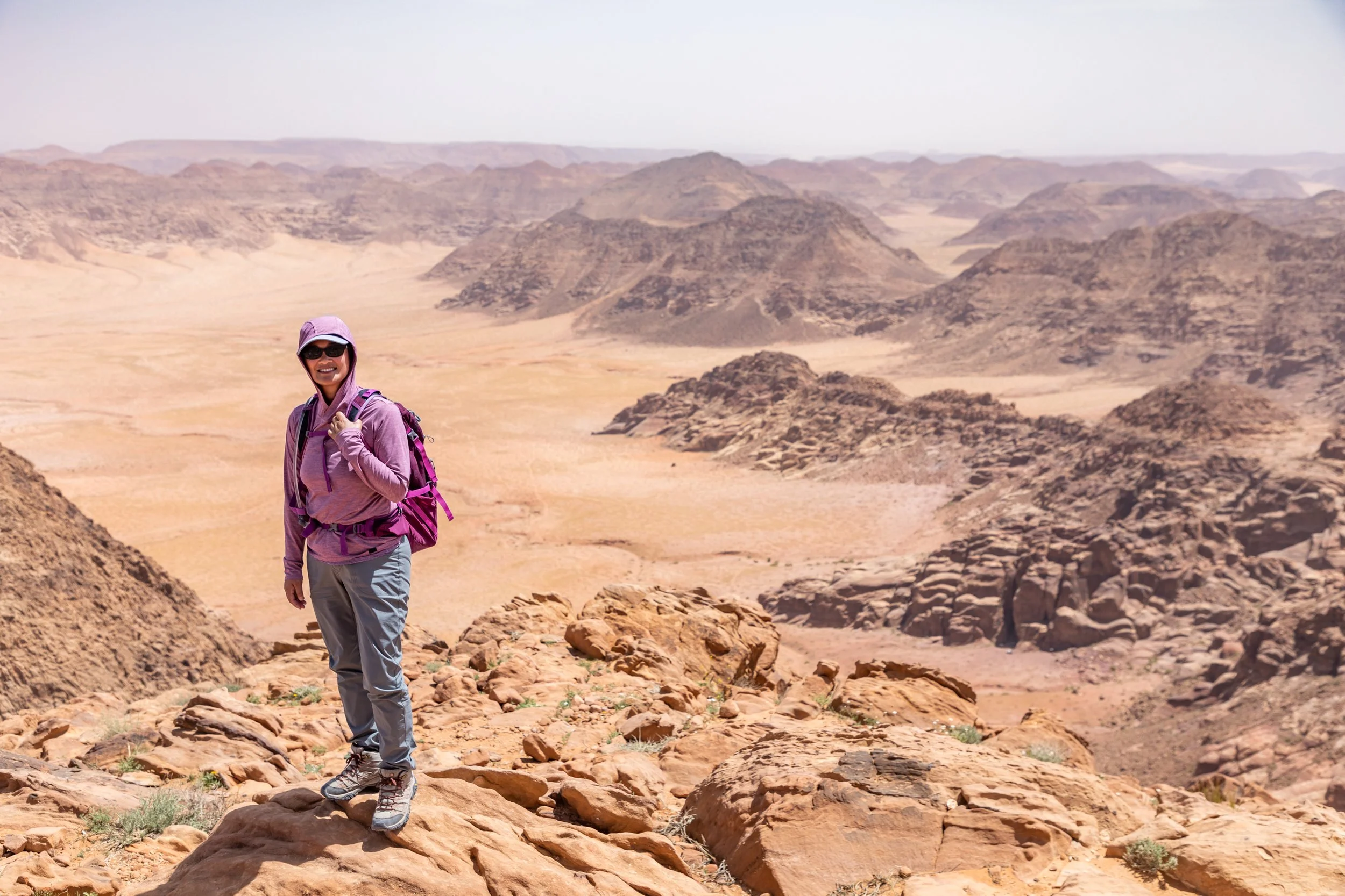 The summit of Jebel Um Ad Dami sits at 6,083 ft. and has a 360 degree panoramic view, looking north into Wadi Rum Preservation Region and looking south, straight across the border into Saudi Arabia. It looked like a painting and each direction was a distinct and unique color palette...beautiful!!