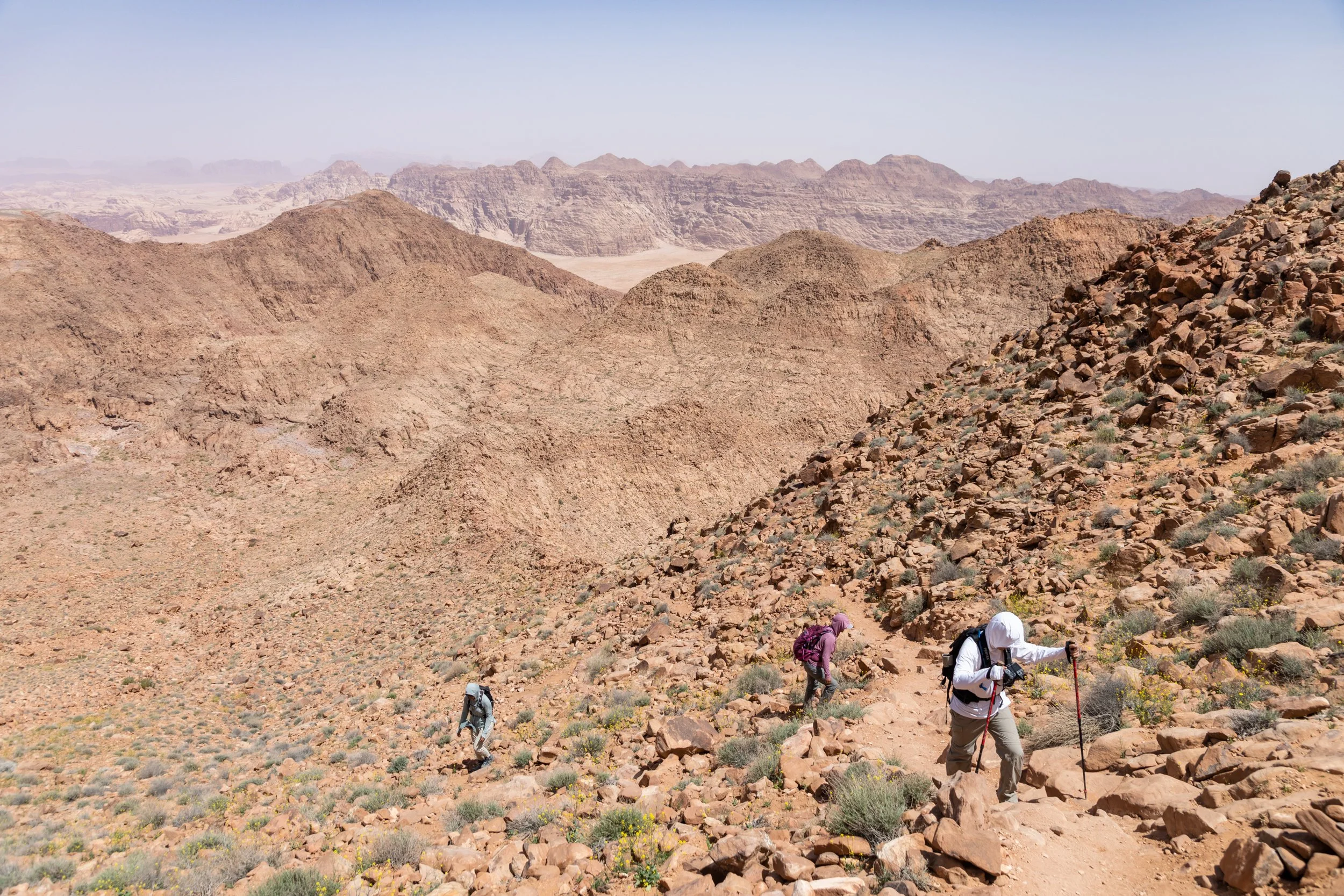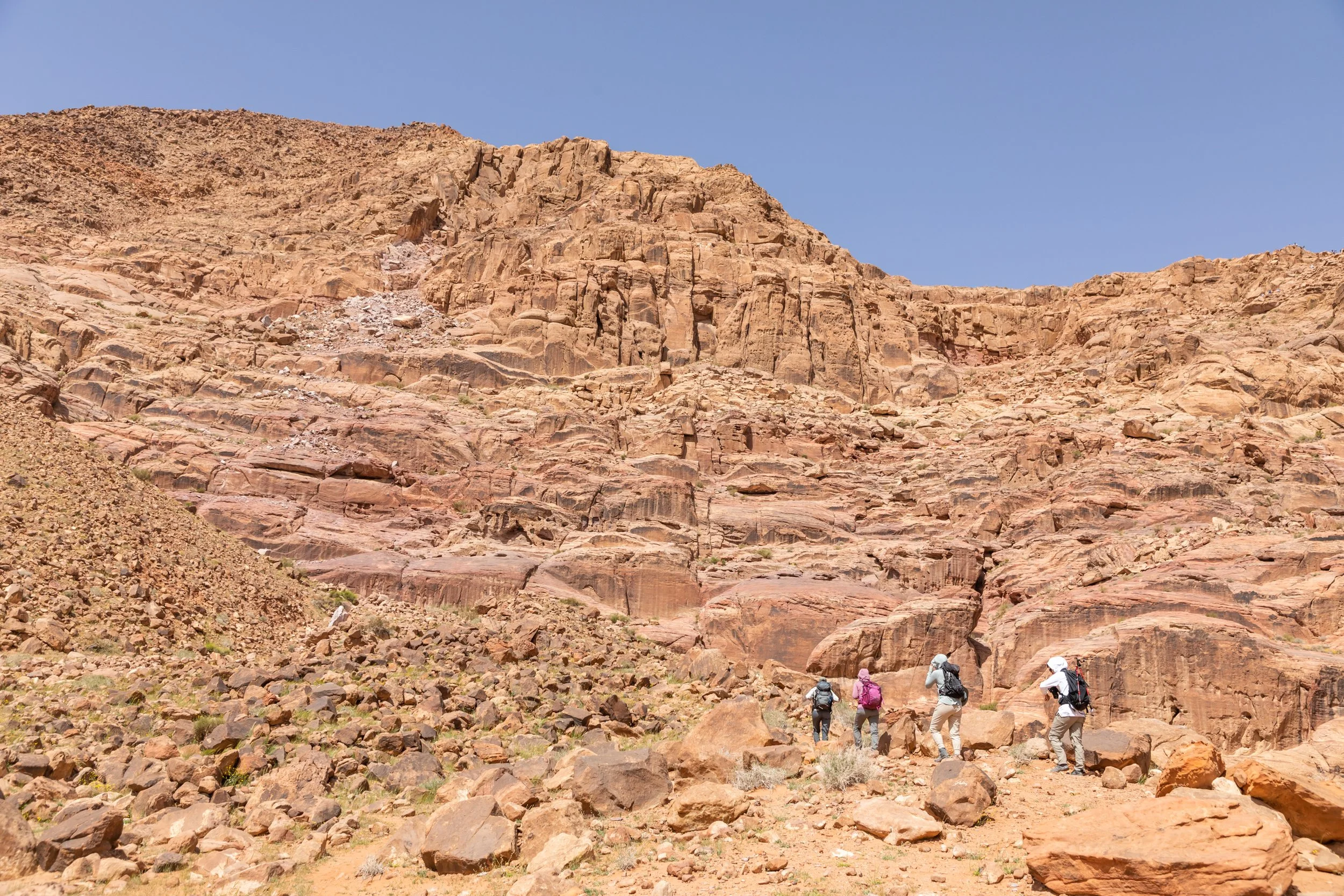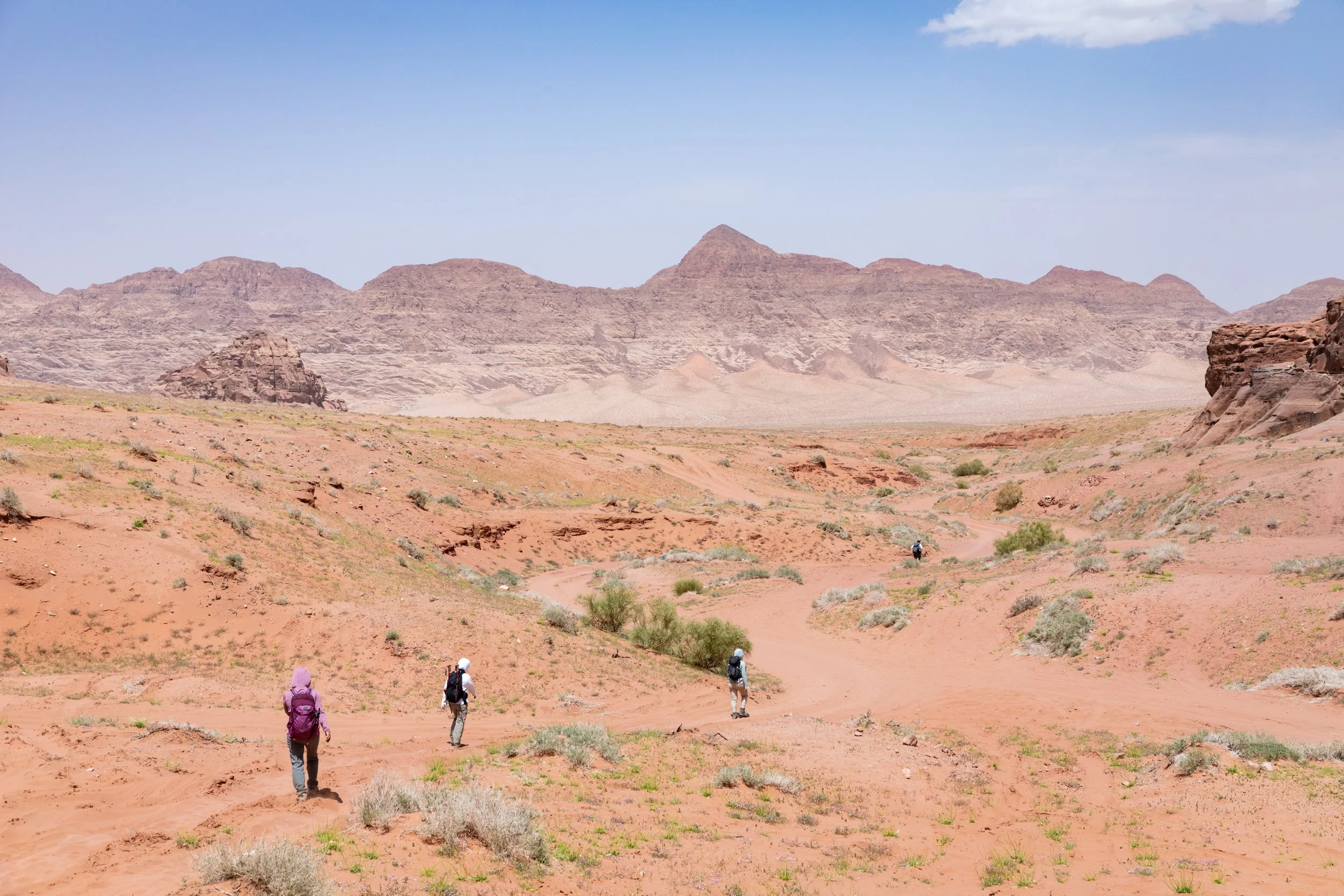 The drive to the trailhead was a gorgeous tour in itself. The camels here, roaming freely seem so much happier and natural than the poor creatures all dolled up in front of The Treasury in Petra. We also noticed lots of green vegetation on the desert floor, flowers and patches of grass big enough to create a sea of green amongst the more neutral sand. This was definitely odd. From the many videos we had seen prior to arriving in Jordan, there was never even a hint of green in the color scheme of Wadi Rum. Lama explained to us that this was a rare occurrence. She had never seen the desert floor bloom like this year either. The abnormally wet spring had brought life to the most inhabitable places in Jordan! And with the vegetation came the roaming camels that are usually not present in the region.