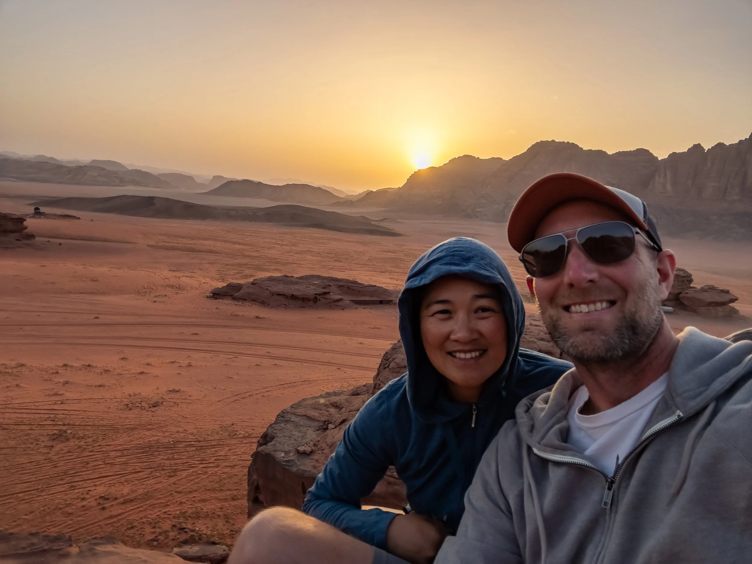 At dinner, we had decided that since Sandy’s never ridden on a camel before, we’d all take the camel sunrise tour. The next morning, we awoke before daybreak expecting to be part of a large group tour. But to our pleasant surprise, it was just the four of us. We had our own private group, exactly how we like things. We slowly jostled our way on top of the camels, traveling less than a mile to a large rock formation with an unobstructed view of the horizon. We spent a long time enjoying the quiet sunrise, staying up there longer than our guide had expected instead of going down and lingering around below drinking sweet tea. When we came down, we quickly gulped our teas and were ready to hop back on our camels for the ride back to camp.