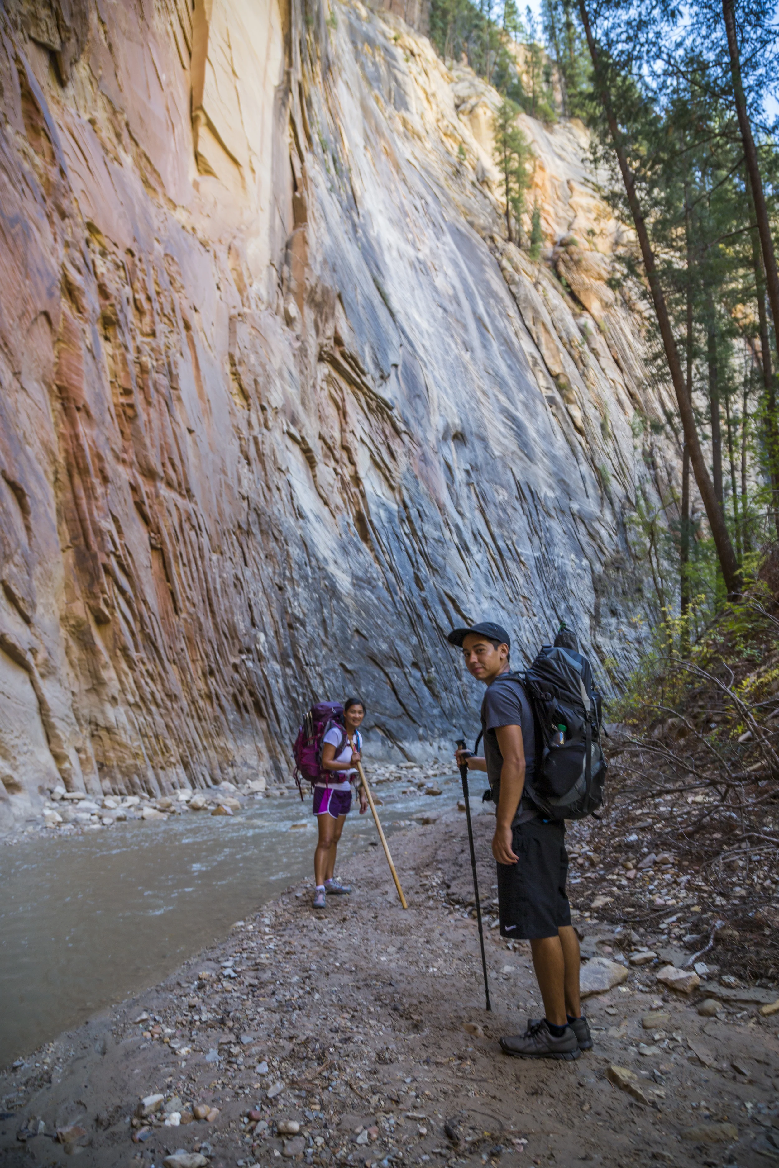 After an overnight drive from L.A. and a quick 2 hour stop in St. George for some sleep, we arrived at Zion Adventures where we planned on renting our gear. After warnings of extremely cold water, we weren't sure how much waterproof gear we needed, and everyone gave us a different opinion. In the end, we rented the walking stick for stability, and those without neoprene socks rented them along with the recommended water boots.